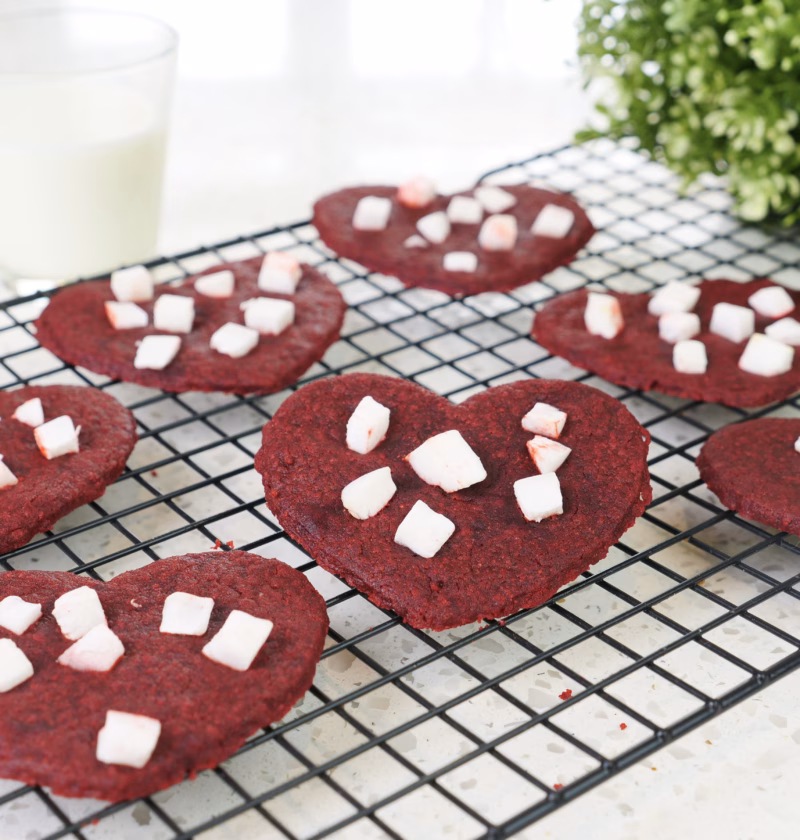 Transfer dough between two sheets of parchment paper. Roll until about 0.5 cm.Cut out hearts with a cookie cutter. Place hearts on parchment paper onto a baking tray. Add coconut chunks on top (optional).